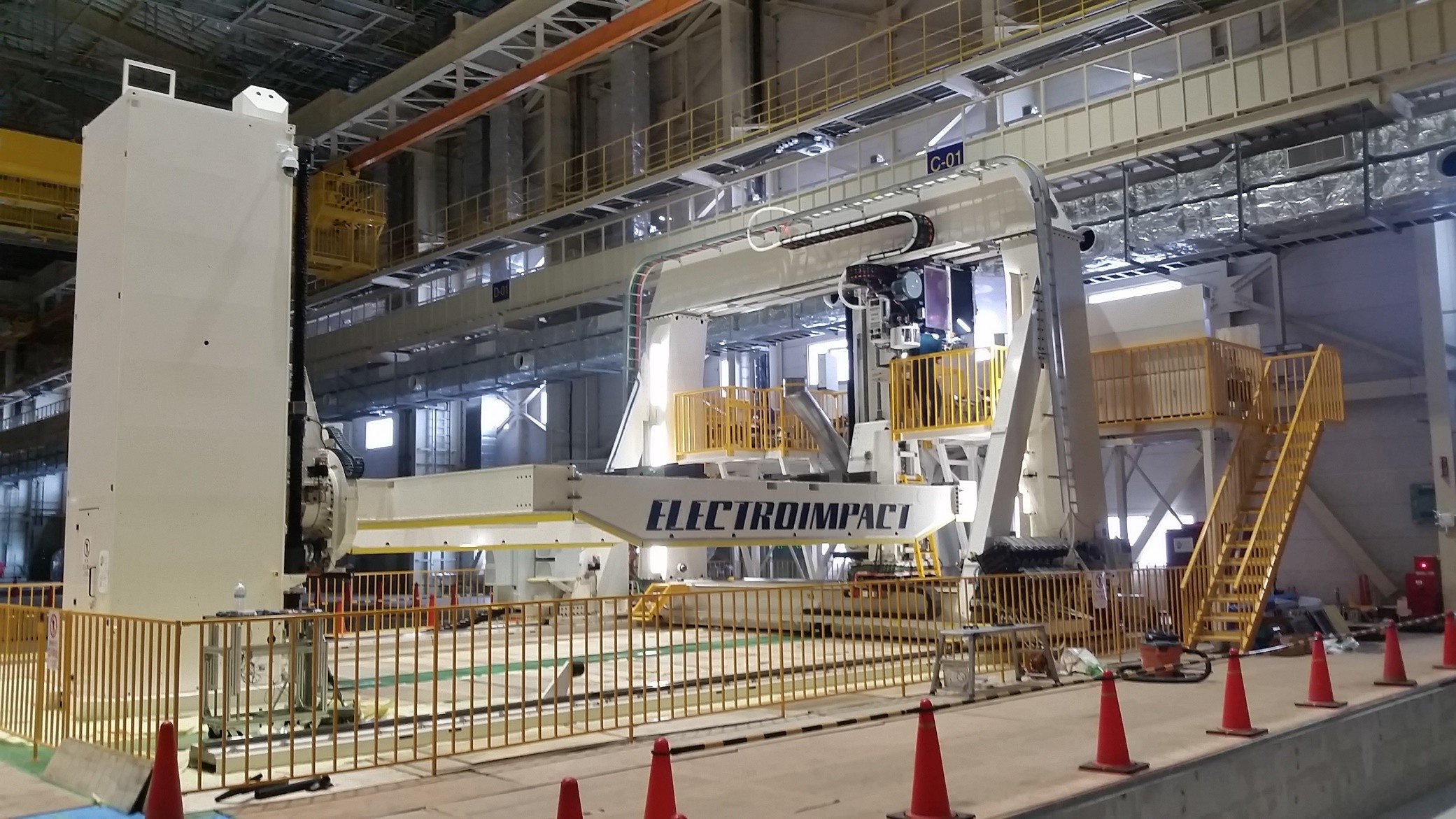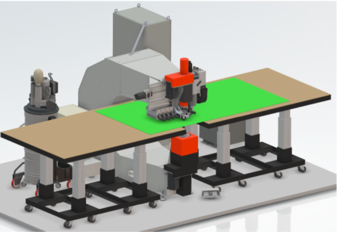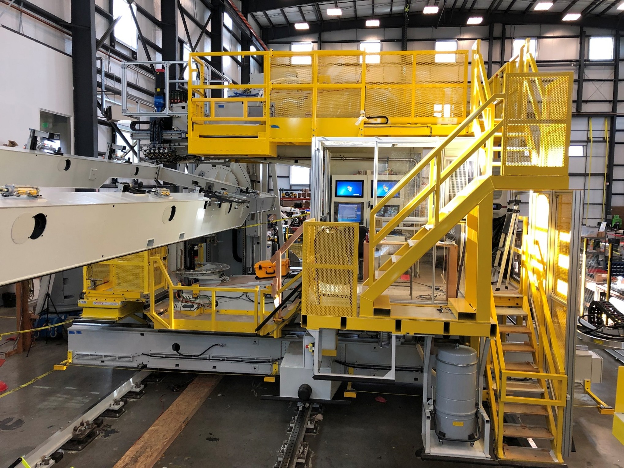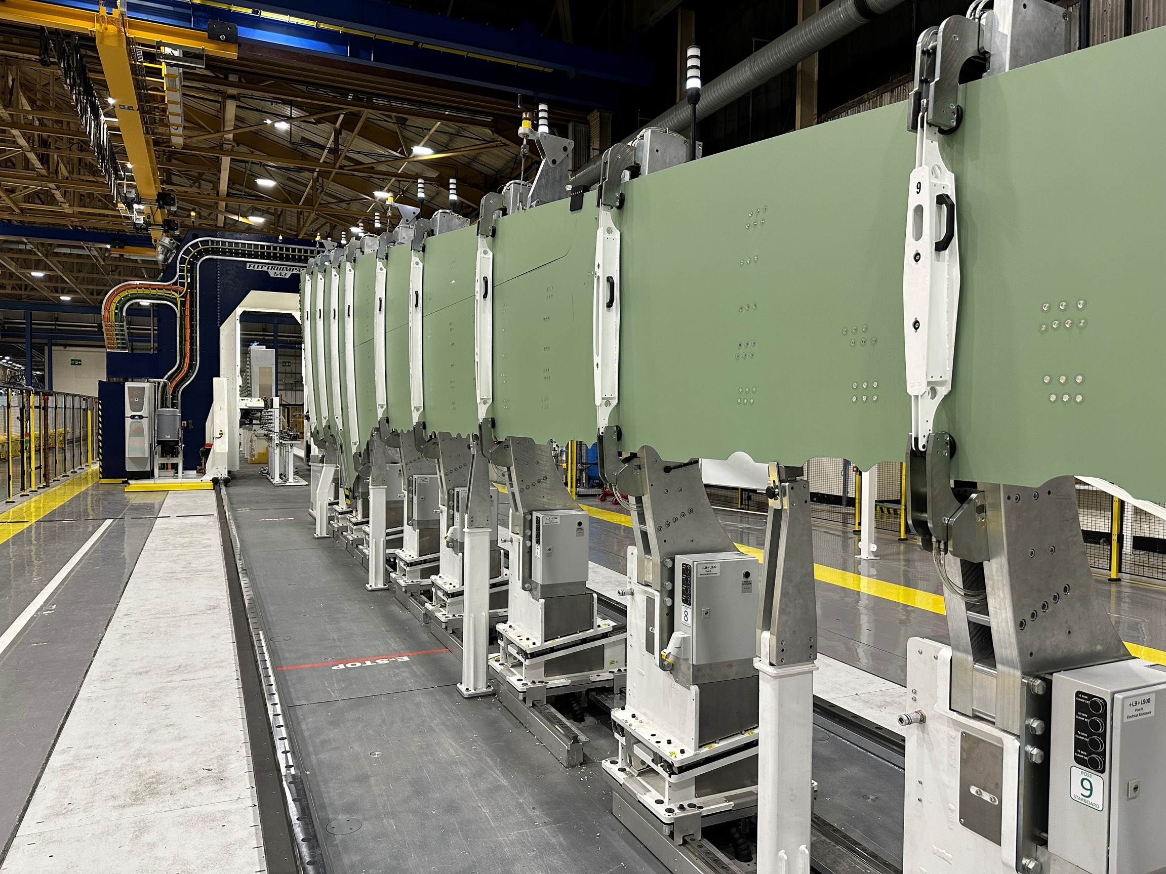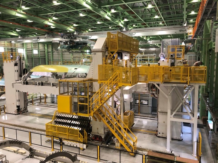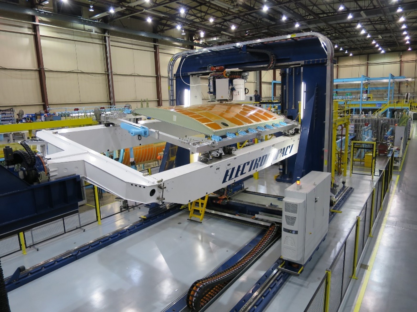 Processes the super panel for the largest commercial aircraft. Features automatic drill changer, automatic upper anvil changer, automatic lower anvil changer which includes a variety of offset anvils. A wide variety of rivets and bolts are automatically fed.